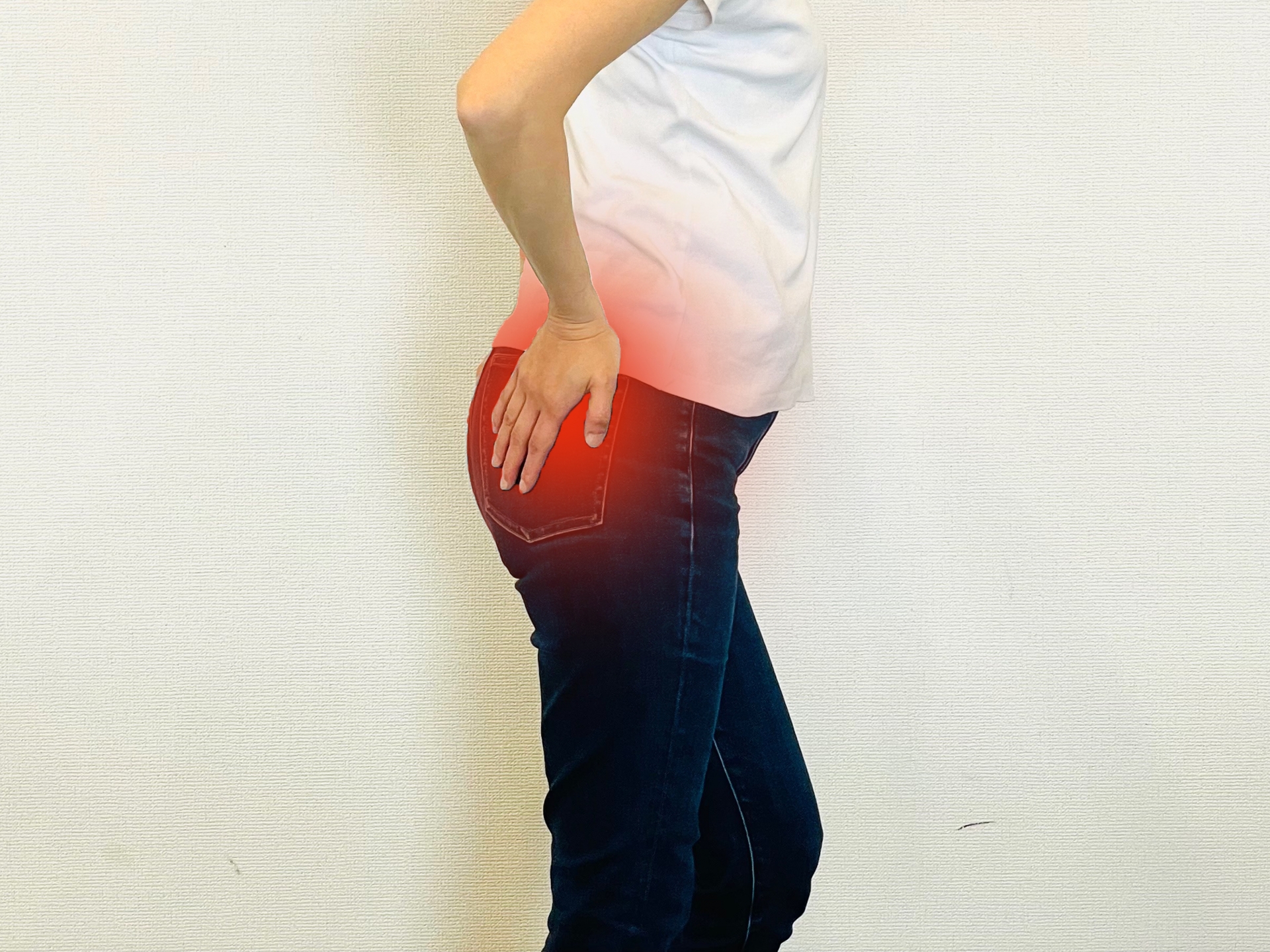 お尻の深層にある梨状筋が過緊張を起こし、その下を通る坐骨神経を圧迫する状態です。長時間の座位やスポーツ動作が関与することが多いです。